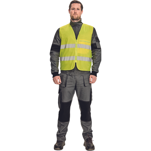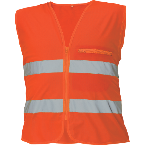 High-visibility vest with 3M stripes, front fastening with zip, two LOCK SYSTEM kangaroo front..