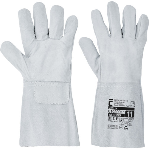 Full leather gloves from cowsplit leather, with 15 cm wide cuff, without lining. Certificate: weldin..