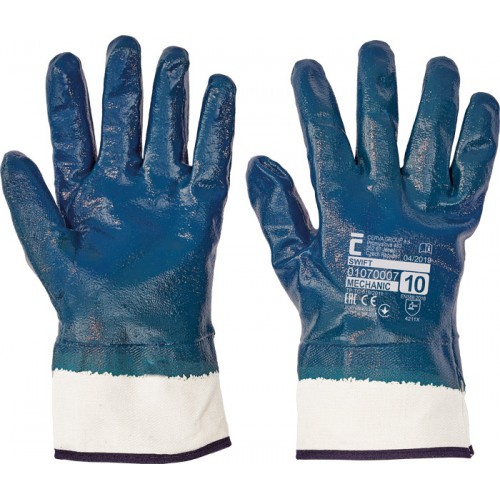 Sewn gloves from jersey liner, nitrile dipped, with tough cuff.