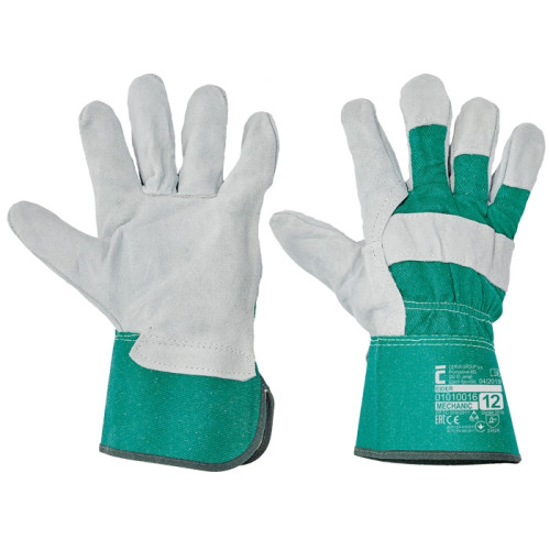 Gloves with cowsplit leather double layer reinforced palm with lining, white cotton fabric back and ..