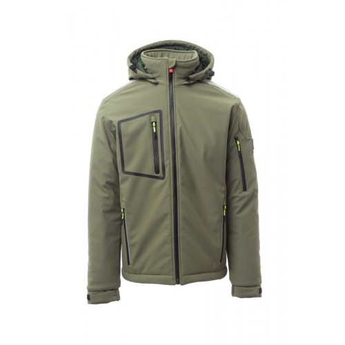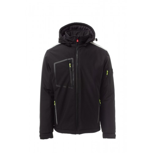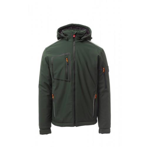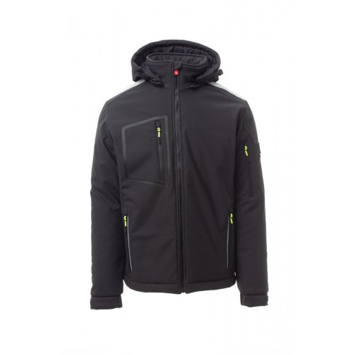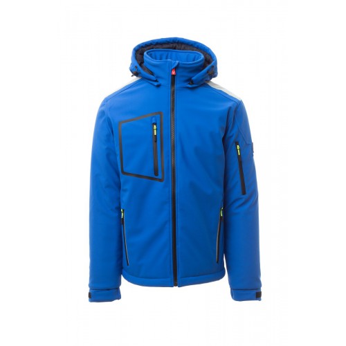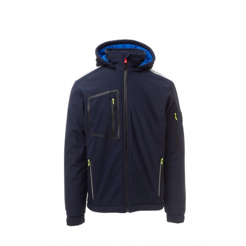 WP 8000 mm H₂O, WVT 5000 g/m² 24h. Men’s padded soft-shell, SBS zip closure with "semi-auto lock" metal slider and customised pull. Adjustable and detachable hood with drawstring. Inner collar with polar fleece side details. Retroreflective strips on shoulders, lower back and back of the hood. Elasticated cuffs, adjustable with Velcro and inner sleeve. Heat-sealed breast pocket, closed with coated zip. Two side pockets, closed with a zip with a retro-reflective detail. Left arm pocket with integrated pen holder, closed with a zip. Fluorescent pullers. Two inside pockets, one shaped breast pocket with zip on the right and one tablet holder closed with Velcro. Adjustable bottom with customised stoppers.