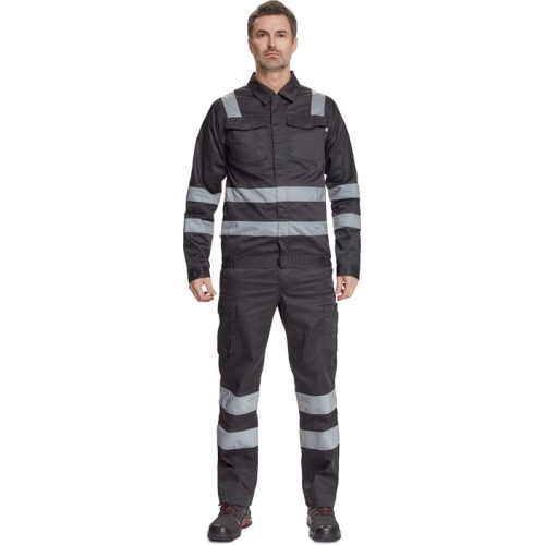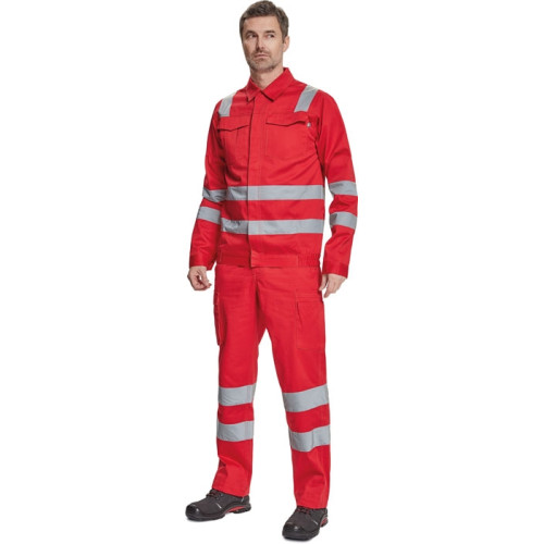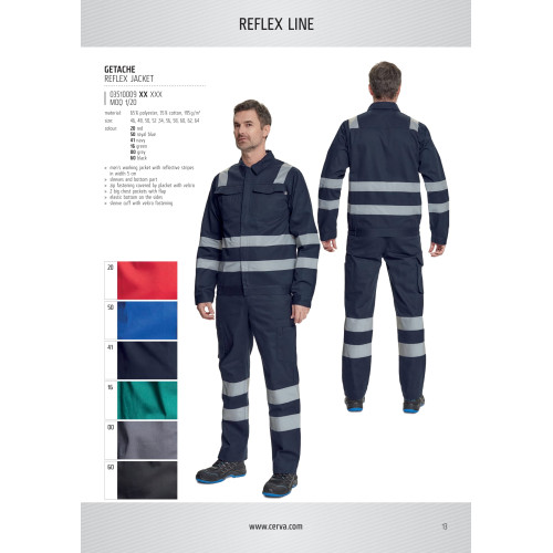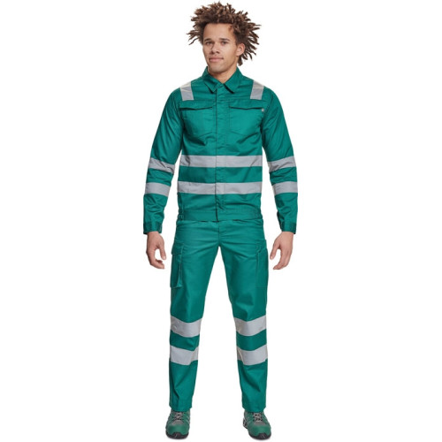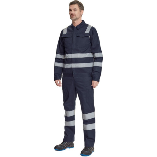 men´s working jacket with retroreflective stripes on shoulders, sleeves and bottom part, zip fastening covered by placket with velcro, 2 big chest pockets with flap, elastic bottom on the sides, sleeve cuff with velcro fastening