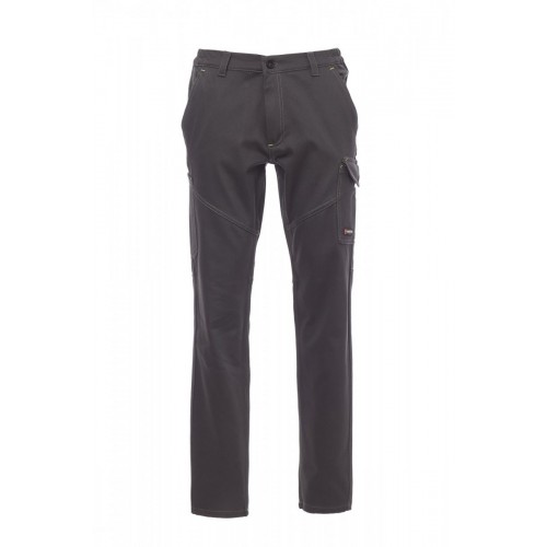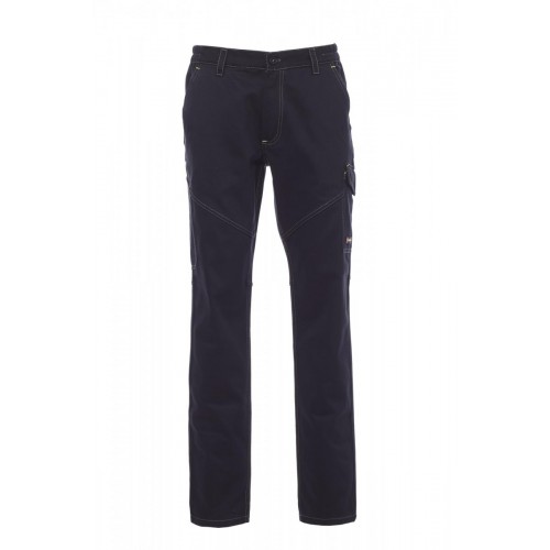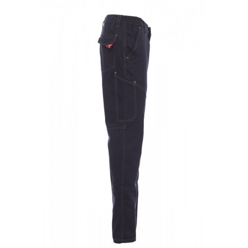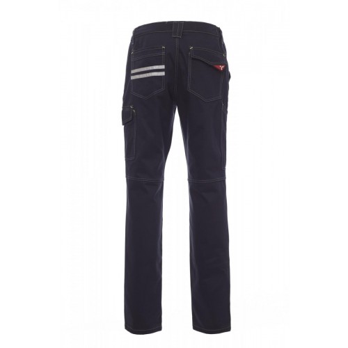 Stretch cotton twill trousers with cat. 1 retroreflective stripes, belt loops and elastic waist, zip..