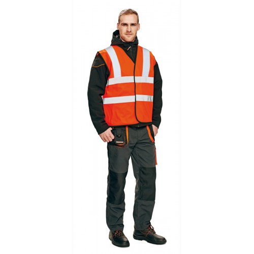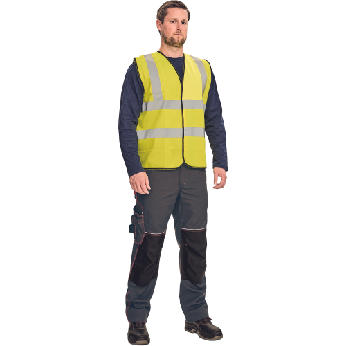 High-visibility vest with 3M stripes, front fastening with zip, two LOCK SYSTEM kangaroo front..