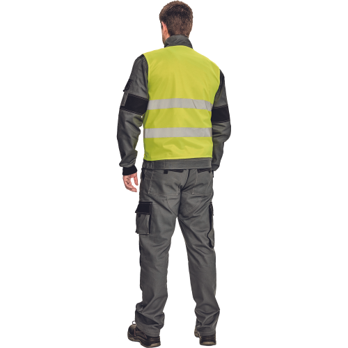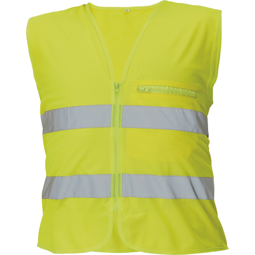 High-visibility vest with 3M stripes, front fastening with zip, two LOCK SYSTEM kangaroo front..
