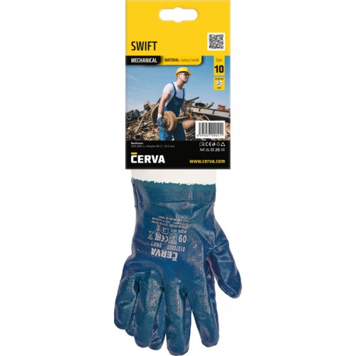 Sewn gloves from jersey liner, nitrile dipped, with tough cuff.