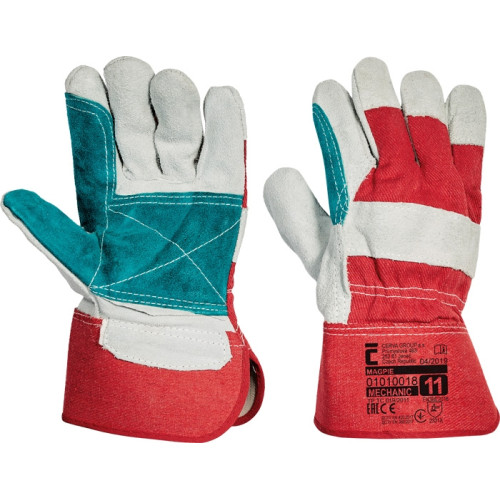 Gloves with cowsplit leather double layer reinforced palm with lining, white cotton fabric back and ..
