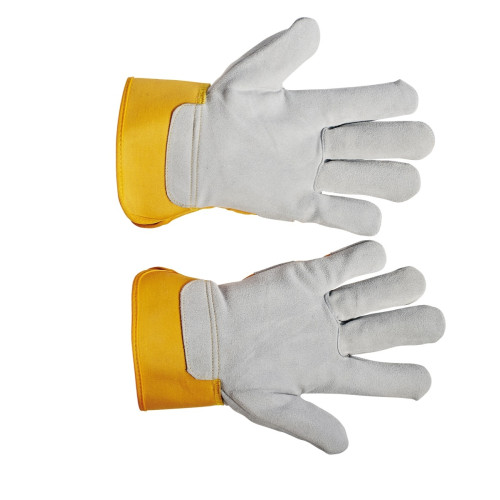 Gloves with cowsplit leather double layer reinforced palm with lining, white cotton fabric back and ..