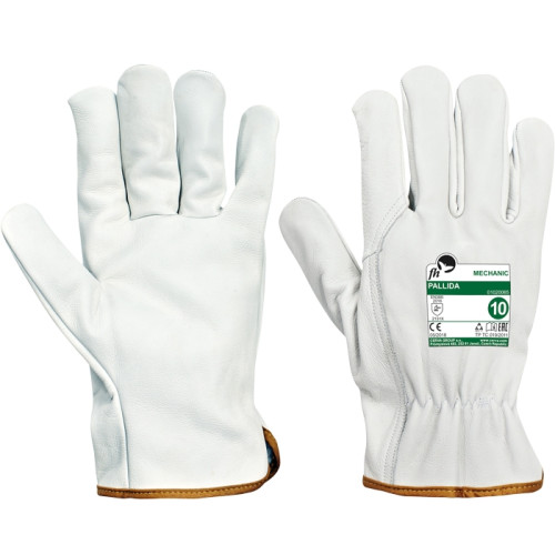 Gloves with cowsplit leather double layer reinforced palm with lining, white cotton fabric back and ..