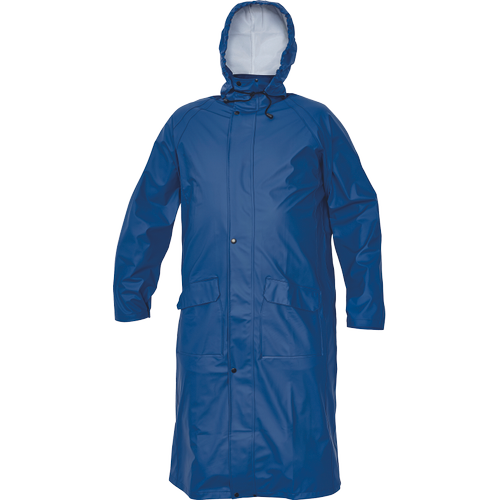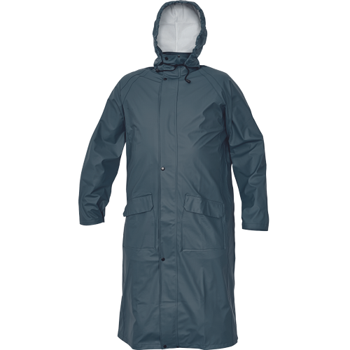waterproof and windproof overcoat with a hood in the collar, 120 cm long; drawstring in hood; 2 flap front pockets; bottom sleeve rim adjustment by poppers.