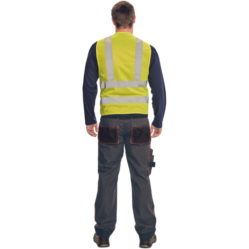 High-visibility vest with 3M stripes, front fastening with zip, two LOCK SYSTEM kangaroo front..