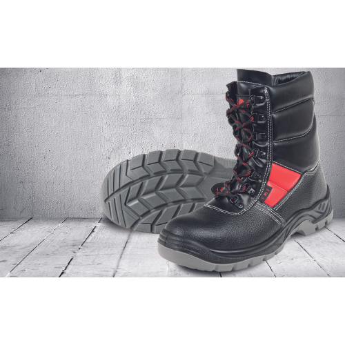 Safety High Ankle shoes – safety steel toe cap and steel insole, PU/PU outsole antistatic and oil resistant, energy absorption in heel area, upper - black buff alo print split leather water resistant, lining grey articial fur.