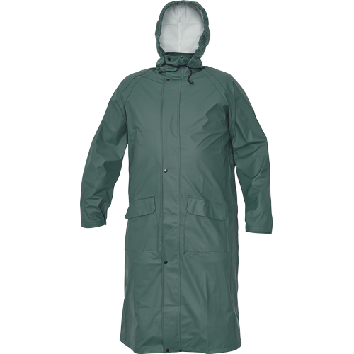waterproof and windproof overcoat with a hood in the collar, 120 cm long; drawstring in hood; 2 flap front pockets; bottom sleeve rim adjustment by poppers.