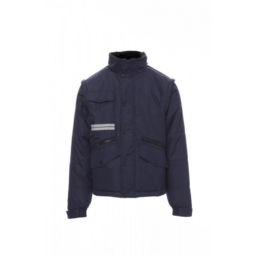 Men’s lightweight jacket with detachable sleeves, 8 mm plastic zip with metal pull, with flap fastening and plastic buttons, contoured back with foldable hood in collar, two LOCK SYSTEM outer pockets, two pockets with zip, slanting pockets for easier access, one smartphone breast pocket and badge holder ring, reflective stripes on the pocket and back. Padded, contrasting fleece lining on the back and collar, one pocket, inner zip for easier printing and embroidery.