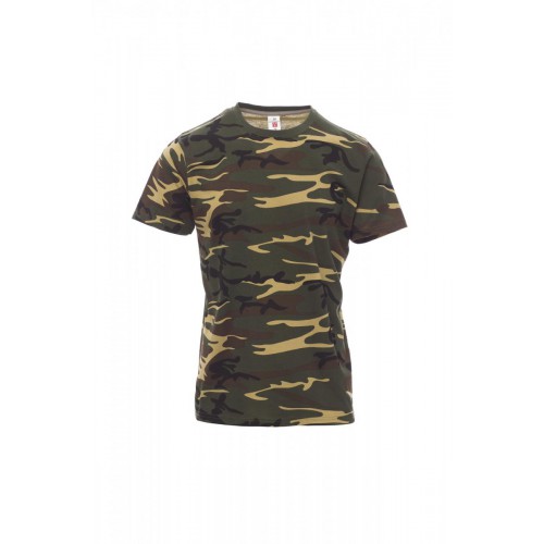Men’s short-sleeved crew neck t-shirt, with 1.5 cm spandex mix rib neckband with top stitching on the front, contrasting shoulder-to-shoulder reinforcement tape visible on the inside collar, stretch seams, tubular design (camouflage version with side seams)
